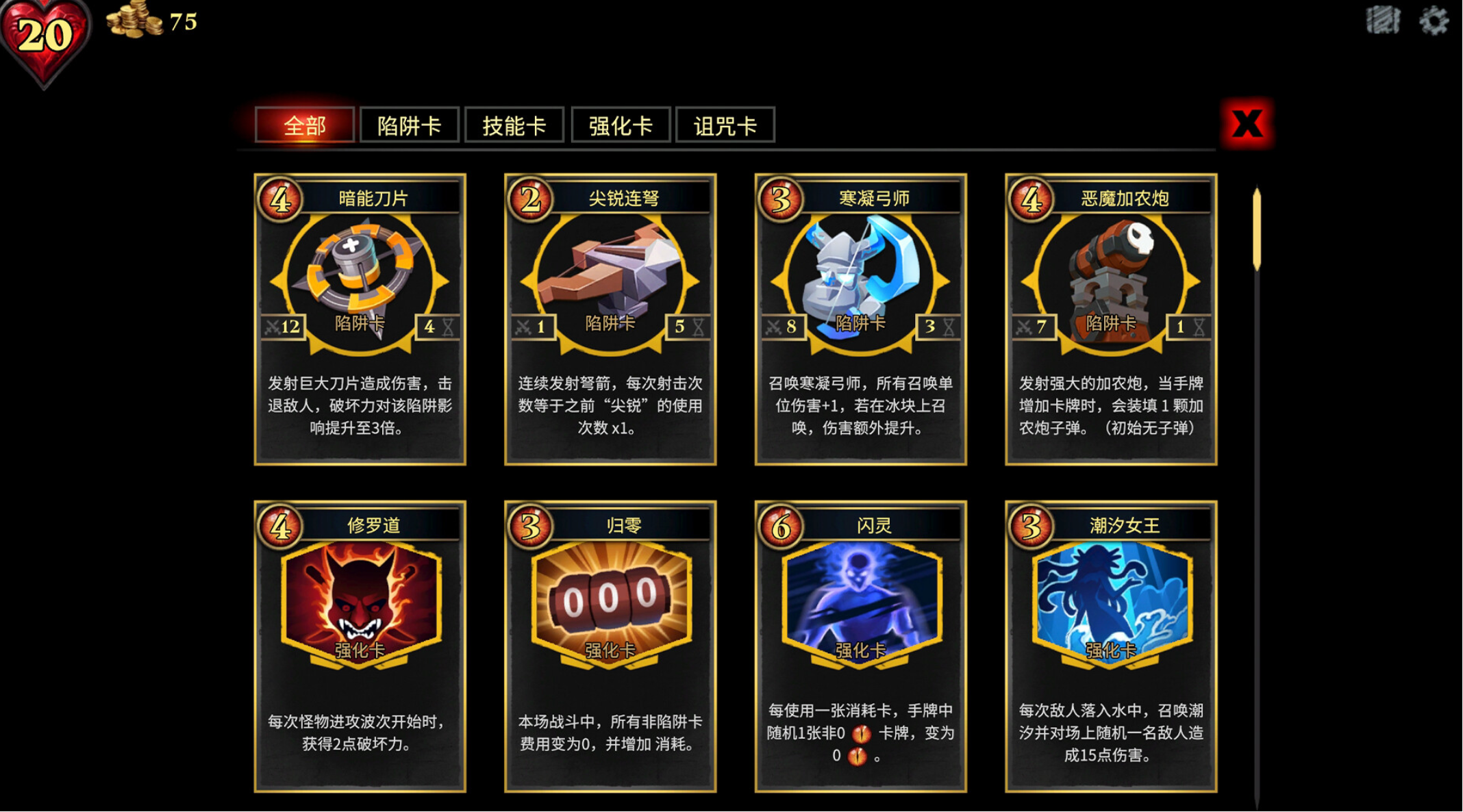 在养成方面,卡牌可以进行升级和铭刻,通过关卡获得的资源可以用来提升陷阱和随从的等级,解锁更多强力效果。铭刻则可以给卡牌附加特殊属性,比如减少冷却时间或增加攻击范围,帮助玩家打造更符合自己风格的卡组。