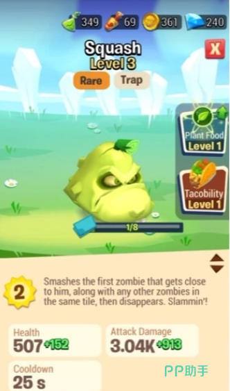 土豆雷:这就是不容忽视的植物,只要是路过的僵尸,全部都会被造成爆炸性的伤害。一般玩家都需要和叶绿素一起搭配,在搭配之后就会产生一个可以出奇制胜的地雷。在爆炸之后还会一路的跳跃,然后这一路上的敌人根本就没有办法抵抗,这简直就是僵尸们的梦魇。在受到伤害之后,还会有一些几率直接就把僵尸击退,这些都是大家所需要注意的。