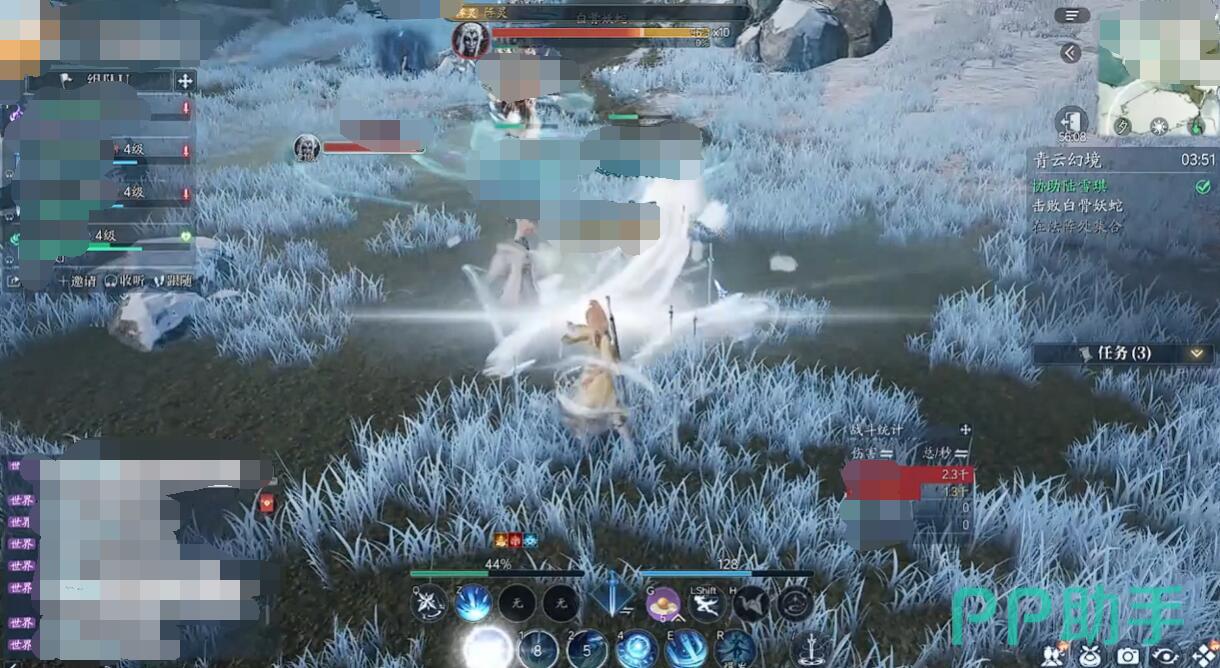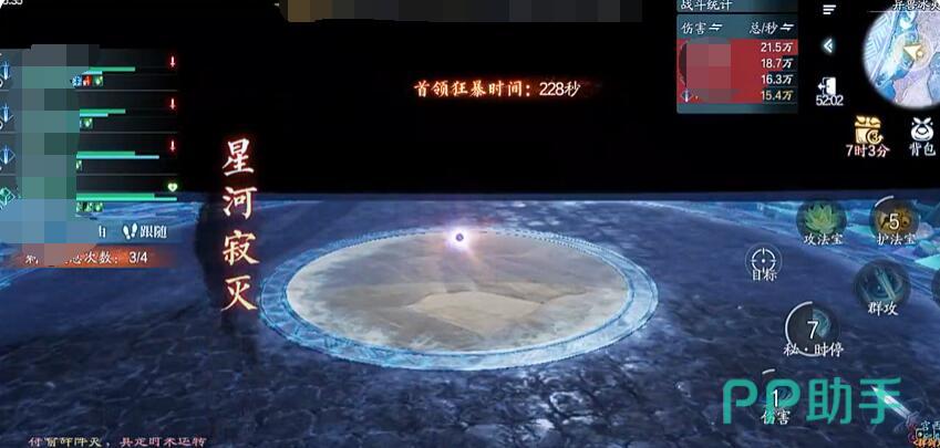 战斗开始后,太昊第一时间开启加速法阵优化全队节奏;焚香看准时机,首要任务就是施放“绝情殇”完成关键的增伤覆盖,增益到位后,青云立刻施展爆发技能“太极玄天真决”进行主力输出,最后由昭冥精准衔接“日月弘光”的第二段伤害进行补刀收尾。