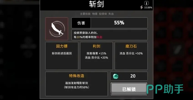 核心技能斩剑需要大家附加一百次失血效果才能达成,由于前期已经将所有非失血技能排除在外,因此每一轮战斗都只能依赖失血技能来叠加计数,通常只需正常通关几个房间便能轻松解锁该强力技能,另一个重要组件是名为芒果的特殊圣器,尽管其描述可能存在误导,但实际上它的作用是对护盾技能进行全面改造升级,实战中应优先提升护盾等级,并在挑战BOSS前的黑色商人处进行特殊强化处理。
