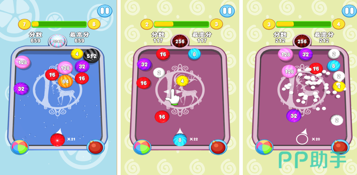 这是款融合了小球合成和2048主题的合成佳作,使用弹射小球互相碰撞的方式合成代入感更强,不同数字的小球标注着不同的颜色很好区分,玩家只需发射不同颜色的球球进行合成即可,相当简单的操作和游戏规则都是本作的亮点,但关卡设有倒计时想要顺利通关还是有一定难度的。
