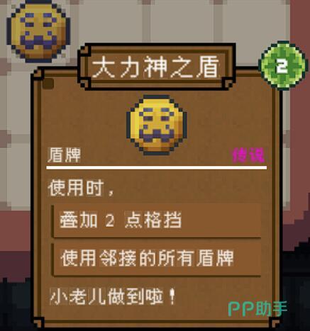 组合防具推荐大力神之盾,邻近每面盾牌提供额外全部格挡,费用为两点。最优摆法是将三块盾牌呈L型放置,触发面积非常广,如果有一格盾牌能凑齐2费触发四盾牌。该盾牌必须与主武器分离摆放,避免占用输出空间。
