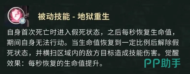 他的地狱重生技能当自身首次死亡时,他会进入到一种特殊的假死状态,在此期间每秒恢复一定的生命值,虽然无法行动,但却为后续的反击埋下了伏笔,一旦生命值回复到一定程度,他将解除假死状态,并对周围区域内的敌人发动猛烈的横扫攻击,造成可观的输出伤害,觉醒效果还能让他在假死期间每秒恢复更多的生命值,提高了他在战场上的存活能力。