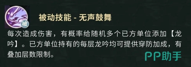 无声鼓舞这一独特技能则在他每次造成伤害时发挥作用,有几率为随机多个队友添加上珍贵的龙吟效果,此效果能够提供可观的穿防加成,他的神明金身技能则根据是否拥有血盾呈现出不同的强大效果,当自身有血盾护体时,能够提升所造成的伤害数值,同时每秒还会对周围敌人造成额外的技能伤害,而当没有血盾时,受到的伤害则会大幅降低,他的觉醒技一旦使用,他将暂时免疫所有伤害,化身为无敌的存在,并且在每次攻击主目标时都有概率追加额外的伤害。