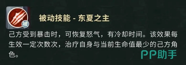 他的东夏之主技能则为团队提供了强大的支持,每当队友遭受暴击时,他能够恢复一定的怒气值,而且该效果每生效一定次数,就会治疗自身和生命值最少的队友,保障了团队的整体血量健康,他的怒气技更是将自身的生命值转化为同等数值的血盾,随后每次普通攻击的范围都会扩大,并附带额外的输出伤害。