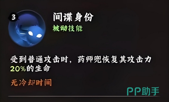 再看他的被动技能之一间谍身份,每当药师兜受到普通攻击时,便会依据自身攻击力的20%恢复生命值,而且这一效果毫无冷却时间的限制,这意味着在战斗中,药师兜能够凭借频繁触发的生命回复机制,持续维持自身的血量健康,极大地增强了他在战场上的生存能力。无论是面对敌人的零星打击还是密集火力,他都能凭借这一技能顽强地站立在前线,为队友分担压力。