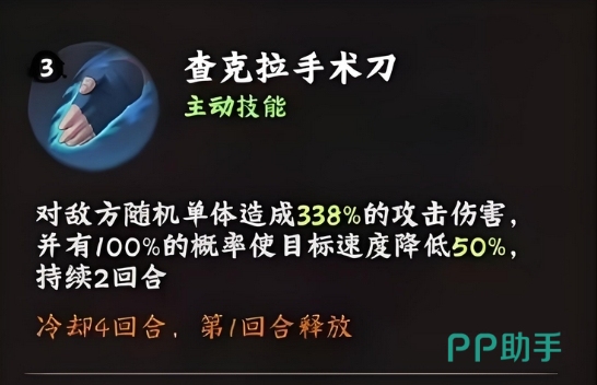 该技能在战斗的第一回合即可果断释放,不过冷却时间需要四回合,值得一提的是,这里所介绍的是技能达到满级后的卓越效果,此时的它已然成为战场上改变节奏的关键所在,当此技能命中敌人后,不仅能直接削减对方的战斗力,还能通过大幅降低其速度来打乱敌方的进攻节奏,为我方创造有利的输出环境,其实目前很多玩家都是不太会用这个减速的,但是就目前而言减速带来的影响是比大家想象中要大的。