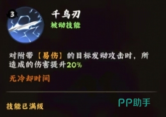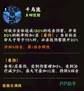 值得一提的是易伤效果极具威慑力,每有一层易伤,敌人受到的伤害会增加3%,同时受到的治疗量减少3%,这一效果最多可叠加至10层,持续时长高达5回合,这意味着一旦敌人被多次施加易伤,他们将陷入极为被动的局面,无论是承受伤害还是恢复生命都会收到一定的影响,再看被动技能千鸟刃,这是佐助在战斗中持续输出的关键所在,目前根据这个易伤的影响其实也会影响到后期大家的配队,所以这个被动跟主动效果其实属于是一个链接起来的能力。