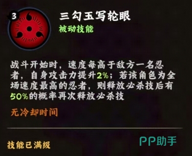 当他对附带易伤状态的目标发动攻击时,所造成的伤害将提升20%,由于没有冷却时间的限制,这个被动技能能够在战斗中频繁触发,与主动技能千鸟流形成的易伤效果相互配合,形成一套高效的伤害循环体系,让佐助的输出能力得到极大提升,他的另一个被动技能三勾玉写轮眼更是赋予了他独特的战术优势,战斗开始时,若佐助的速度每高于敌方一名忍者,自身攻击力便会提升2%。