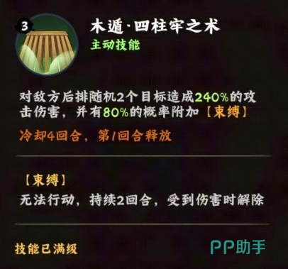 先来说说大和那令人惊艳的主动技能木遁四柱牢之术,此技能一旦施展,便会精准锁定敌方后排的随机两个目标,瞬间爆发出高达240%攻击力的强大伤害,这伤害数值本身就足够输出,且更为关键的是,它还附带了高达80%几率的束缚效果,一旦敌人不幸被束缚,在接下来的两回合内将完全无法行动,不过,当受束缚的敌人受到伤害后,这一状态便会解除。