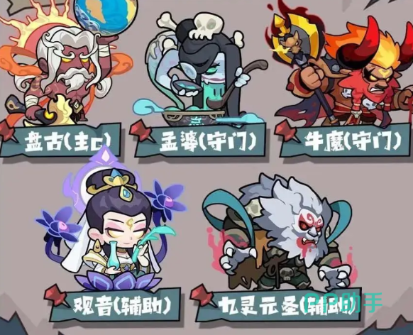围绕盘古构建的阵容,必须在保护、辅助与增益方面全面兼顾,推荐的搭配:盘古(主C)、孟婆(守门)、牛魔王(守门)、观音(辅助)、九灵元圣(辅助)。孟婆回血支援,使大门能稳住并触发盘古被动增伤。牛魔王前排肉盾加击退。