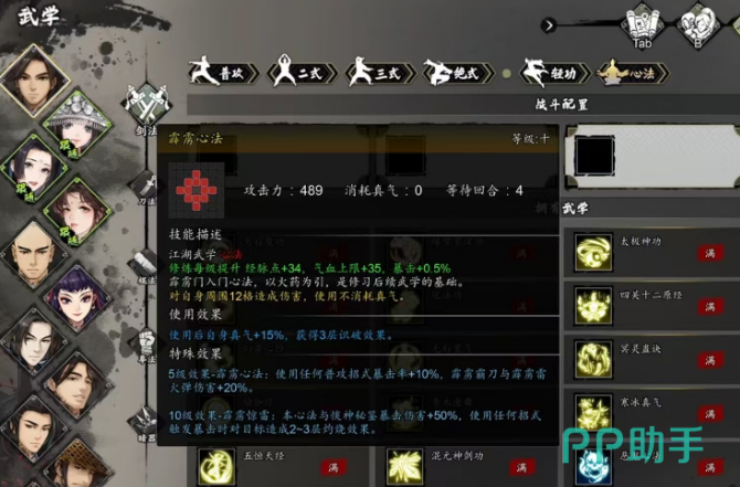 霹雳心法是一门基础性江湖武学心法,其效果相当实用。每一层的提升都会带来34点经脉点、35点气血上限和0.5%的暴击加成。作为霹雳门的入门心法,它不仅为后续的武学发展奠定基础,还能对12格范围内的敌人造成伤害。而且,霹雳心法的一个显著特点是使用时不消耗真气,且使用后会增加15%的真气并获得三层识破效果。当心法提升至第五层时,所有普通攻击的暴击几率将增加10%,同时霹雳霸刀和霹雳雷火弹的伤害也会提高20%。而在十层时,霹雳心法触发的“霹雳惊雷”效果将使得本心法和惔神秘鉴的暴击伤害增加50%,并且任何招式暴击时,将使目标产生2至3层灼烧效果。