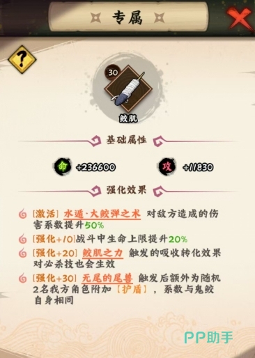 无尾的尾兽属于有护盾加持的被动,这个被动则展现了鬼鲛作为重装战士的另一面,战斗伊始便获得的攻击力300%吸收型护盾,不仅数值惊人,其动态防御机制更能适应不同强度的战斗环境,无论是面对BOSS的巨额单体伤害还是小兵的集火攻击,护盾均能按比例吸收相应伤害,确保鬼鲛始终处于安全血线之上,强化+30后额外为两名队友附加同系数护盾的设计,更是将个人优势扩展为团队屏障,使鬼鲛从独行侠蜕变为阵型核心。