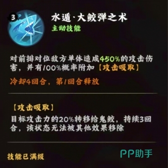 干柿鬼鲛的主动技水遁·大鲛弹之术,该技能的核心在于对前排单体造成高达450%攻击伤害的同时,附带强制生效的攻击吸取效果。这一设计绝非简单的数值叠加,而是通过削弱对手+强化自身的双重逻辑重构战场格局,目标攻击力的20%被转移至鬼鲛身上且无法驱散的特性,意味着敌方核心输出单位将陷入恶性循环,越是试图反击,越会加速自身被击杀的速度。