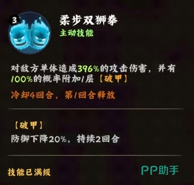 日向雏田的主动技柔步双狮拳,是精准破防的起手式,该技能作为雏田的核心输出手段,可以对单体目标造成396%的超高倍率伤害,这在游戏前期即可形成秒杀脆皮单位的威慑力,更重要的是100%附加破甲效果,直接降低目标20%防御持续2回合,这一机制打破了传统输出依赖单纯堆砌攻击力的模式,转而通过削弱敌方防御实现伤害最大化,例如在面对高防坦克型敌人时,一次成功的破甲足以令后续普攻或队友技能产生输出提升的效果,此外4回合的冷却周期与首回合必放的特性,要求玩家必须抢得先手优势。