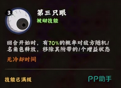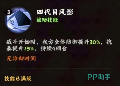 其被动技能第三只眼同样不容小觑,在每个回合开始之际,有70%的高概率对敌方随机一个角色发动效果,能够将其身上附带的一个增益状态彻底移除,并且这个技能没有冷却时间的限制,意味着在整个战斗过程中,它都有可能频繁触发,不断干扰敌方的战斗节奏与状态加持,另一个被动技能四代目风影更是为团队带来了强大的集体增益效果,当战斗打响之时,我方全体忍者的防御属性将提升30%,抗爆能力也会增加15%,而且这一效果能够持续长达4个回合。