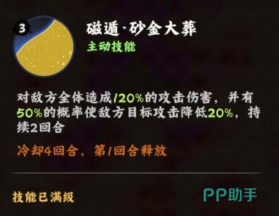 罗砂在游戏中的定位是前排减益辅助,其自身属于心类型属性,这一品级的忍者往往是玩家在操控战斗时的核心力量,故而全面了解他的技能特点至关重要,他的主动技能磁遁砂金大葬,一旦施展开来,便能对敌方全体目标造成等同于自身攻击力100%的伤害打击,不仅如此,该技能还拥有50%的几率使敌方目标的攻击力降低20%,且这一攻击降低效果能够持续两个回合之久。