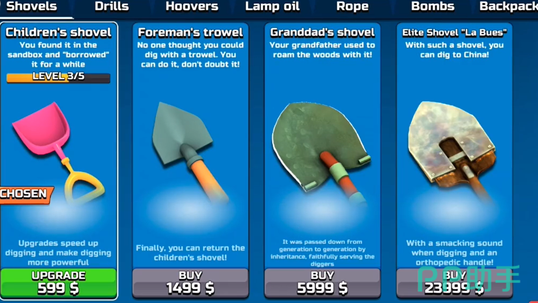 挖掘出来的宝贝玩家可以选择放入到背包中或者是进行售卖,都可以为我们带来更多金币。当金币达到一定程度时,还能将自己已有的挖掘工具进行升级,在挖掘时能够加快挖掘的速度。无论是工具的购买还是工具的升级,都需要使用不同数量的金币。如果遇到坚硬的石头,我们还可以选择炸弹,将这些石堆全都炸开,使前路畅通无阻。并且设置了多种画面场景,在视觉上也给玩家朋友们营造出极为丰富的体验。