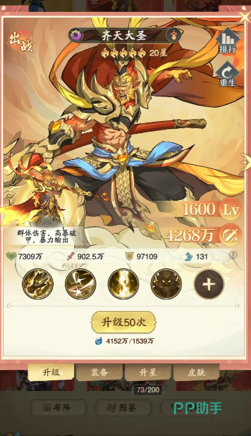齐天大圣的被动会在生命首次低于30%的时候,解除神兽的所有控制并直接恢复战斗力,他的“灵猴棍法”在使用后会临时提升自己20%破甲,随后打出3次连击,对全部敌人造成122%的伤害并让自身获得一层灵猴,灵猴可叠加,能永久提升携带者1%的攻击力与暴击率。