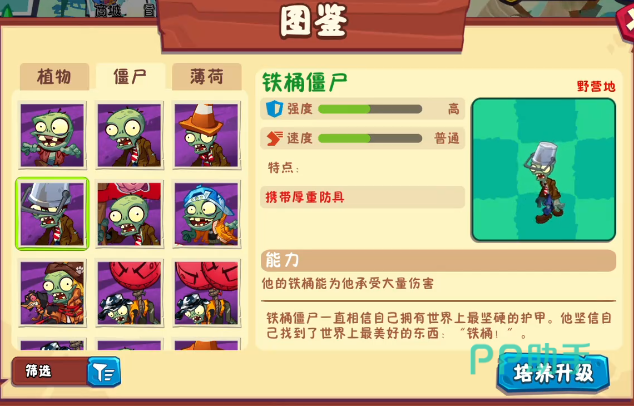 这是强度偏高的僵尸,速度中等,头上顶着铁桶,正是这个铁桶,让他能承受巨大的伤害,它一直相信自己拥有世界上最坚硬的护甲,铁桶就是他觉得找到世界上最美好的东西。