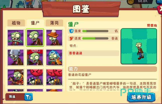 这就是最普通的花园僵尸,走路晃晃悠悠,像个刚睡醒出门找吃的的大爷,梦想就是有吃不完的脑子。它的特点就是普普通通,毫无特色,速度中等,强度不高。