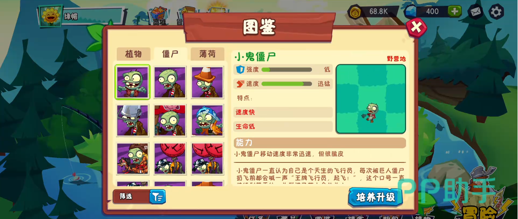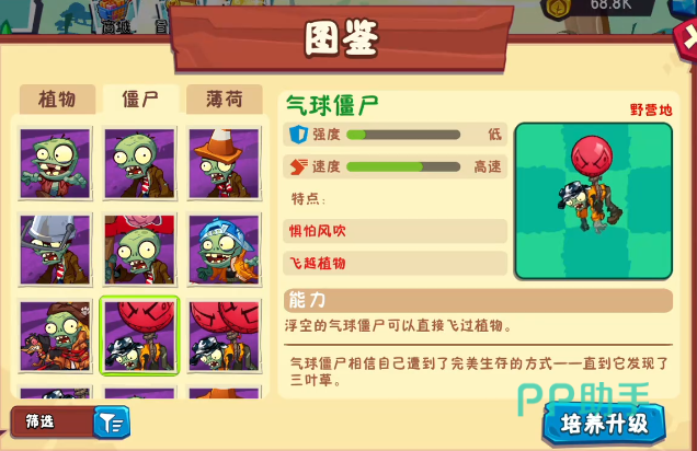 虽然这个的强度比较低,但是其速度则是很快的,它的能力比较特殊,浮空的气球带着他可以直接飞过植物,普通的防守都无法抵御他的飞跃,无法对其造成伤害,但是它惧怕风吹。它还有个进阶版,“抗风气球僵尸”,它的身上有两个气球,这个版本的它就不惧怕风吹了。