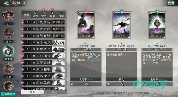 技能是“一技多用”的,同一个招式可装配在主动,被动,甚至追击技能上,使用银币升级提高技能数值强度,碎片升阶提高发动概率和装配次数。