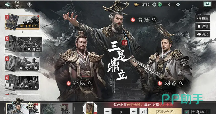 英雄获取:通过“招募”能获得,天下归心是常驻的卡包,能获得所有的角色,每间隔12小时就能领取1次免费卡包招募的机会,将主线第三章完成后,全部卡包的招募机会就解锁了。举例来看,三足鼎立卡包中,绝品品质英雄固定为曹操,孙权,刘备。卡包除了能获得角色,还能获取不同的技能,特殊卡包的技能也是固定的。