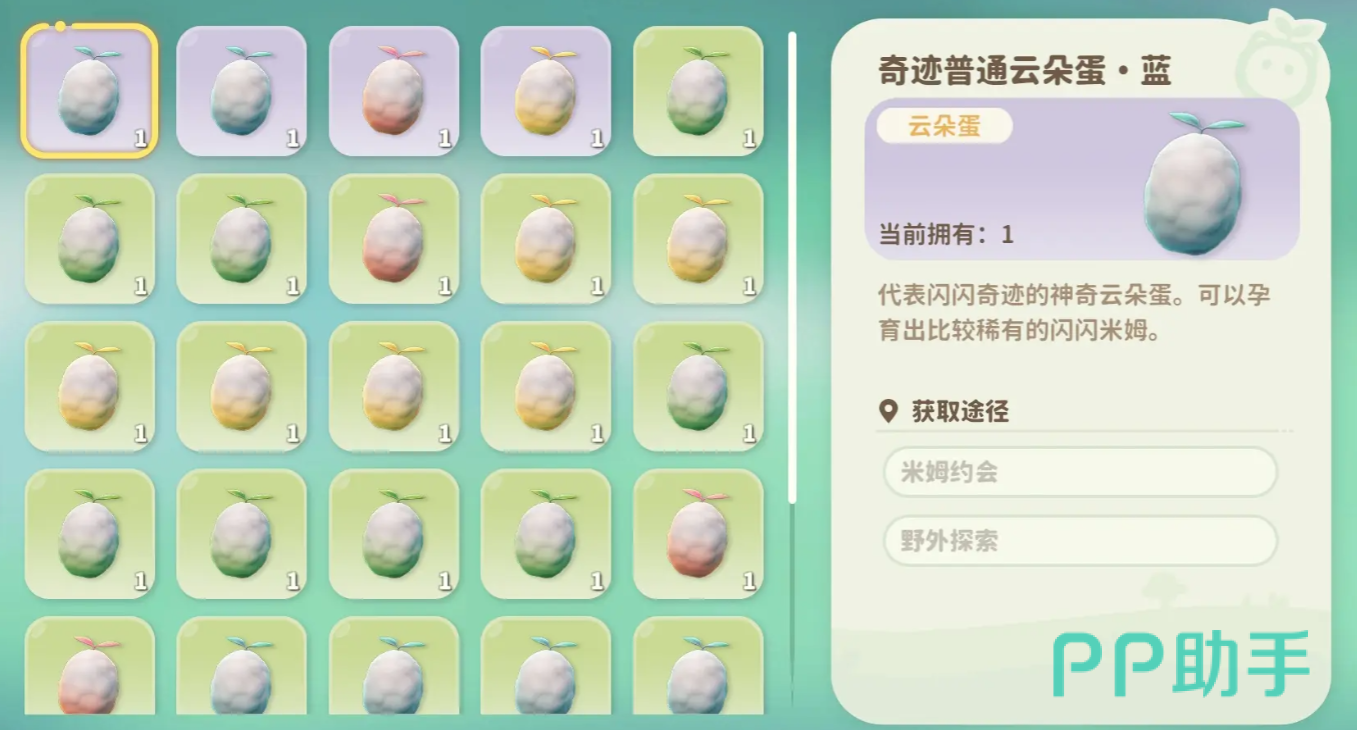 需要注意如果是约会产出的云朵蛋,将会遗传到父母的部分属性,所以我们选择的两只词条等级是越高越好,获取的云朵蛋如果是蓝色,会出水系如蓝蓝鼠、大耳象等米姆,是绿色会出植物系,如桃桃猴、草帅枭,是棕色会出土系如蓬蓬哈、门牙兔。