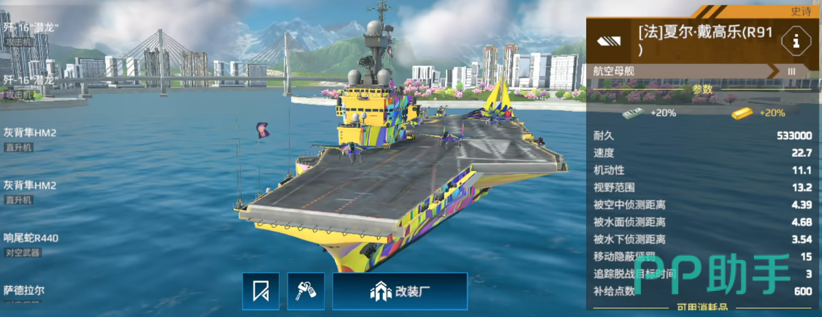 远程压制与战略消耗的终极杀器,具备“双攻击机+3+1直升机”配置,搭配打击时刻或苏39等强力攻击机后,可以无缝打击压制。敌人的防空区在戴高乐的轮番空袭下将被逐渐撕裂,尤其适合目前点灯机制改动后的战场节奏。除了空袭能力,它的自保能力同样出色,三类直升机配置让它在反潜和对近战压迫中也不失为一员猛将。