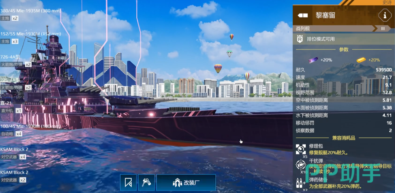 新版本中黎塞留遭到部分削弱,如主炮暴击率下降、速度减慢等,但打不过就跑,跑不过就追的综合能力仍旧无法忽视。不过在对抗航母时,缺少自由导弹以及电子干扰设备的短板依旧明显,面对高空打击时往往需要依赖队友提供反导支援。