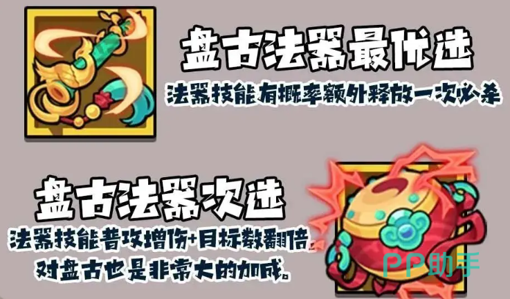 法器与遗物的选择也有影响,盘古最推荐具备概率额外释放必杀技的,其次是增伤类、目标数增加类的。遗物方面,绞肉机、扫帚、小刀、食吸尘器等物理吸血与流血增强型道具则能有效提升团队续航能力。