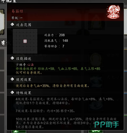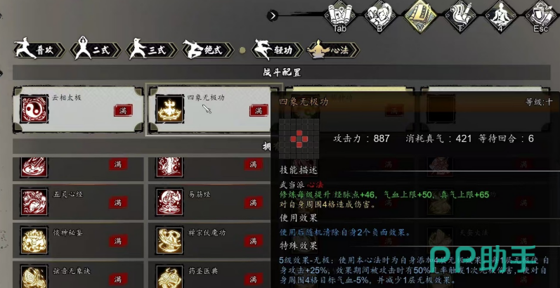 四象无极功作为武当门派的代表心法,获得方式并不复杂,只需要通过门派请教便能习得。这项心法的核心优势就在于它强大的范围伤害以及对负面效果的清除能力。使用四象无极功后,能够对周围四格内的敌人造成伤害,同时有机会清除自身的两个负面效果,这让它在多种战斗场景中表现得尤为灵活。而当这项心法升至5级时,还能触发无极效果,使自身的攻击力得到大幅提升。每一层无极效果都能增加25%的攻击力,最多叠加四层,这意味着满层之后,攻击力可以提升高达100%,让你瞬间化身输出怪兽。