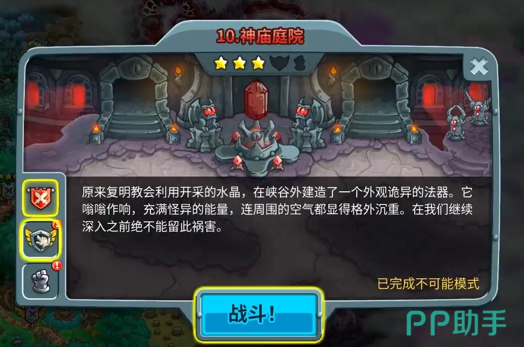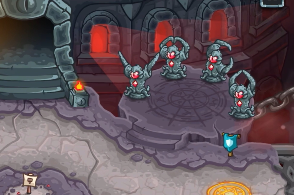 神庙庭院共有四个出怪口,左边两个和上边两个,它们会在中间进行交汇,同时玩家也需要守三个门,右边两个和下边一个,因而本关敌人的行进路线为从左至右和从上至下,所以玩家们在布置防线时,重心可以放在中间交汇处,确保防御塔的伤害能打到尽可能多地敌人。此外,在开始挑战前,各位点击关卡右上方的雕像,从左至右分别将雕像摆成双手朝上打开、双手在头上摆出爱心,双手朝左摆出爱心和双手朝上闭合这四种状态,完成后只需等上2秒,就会触发雕像彩蛋,出现4个帮手来协助玩家守关。