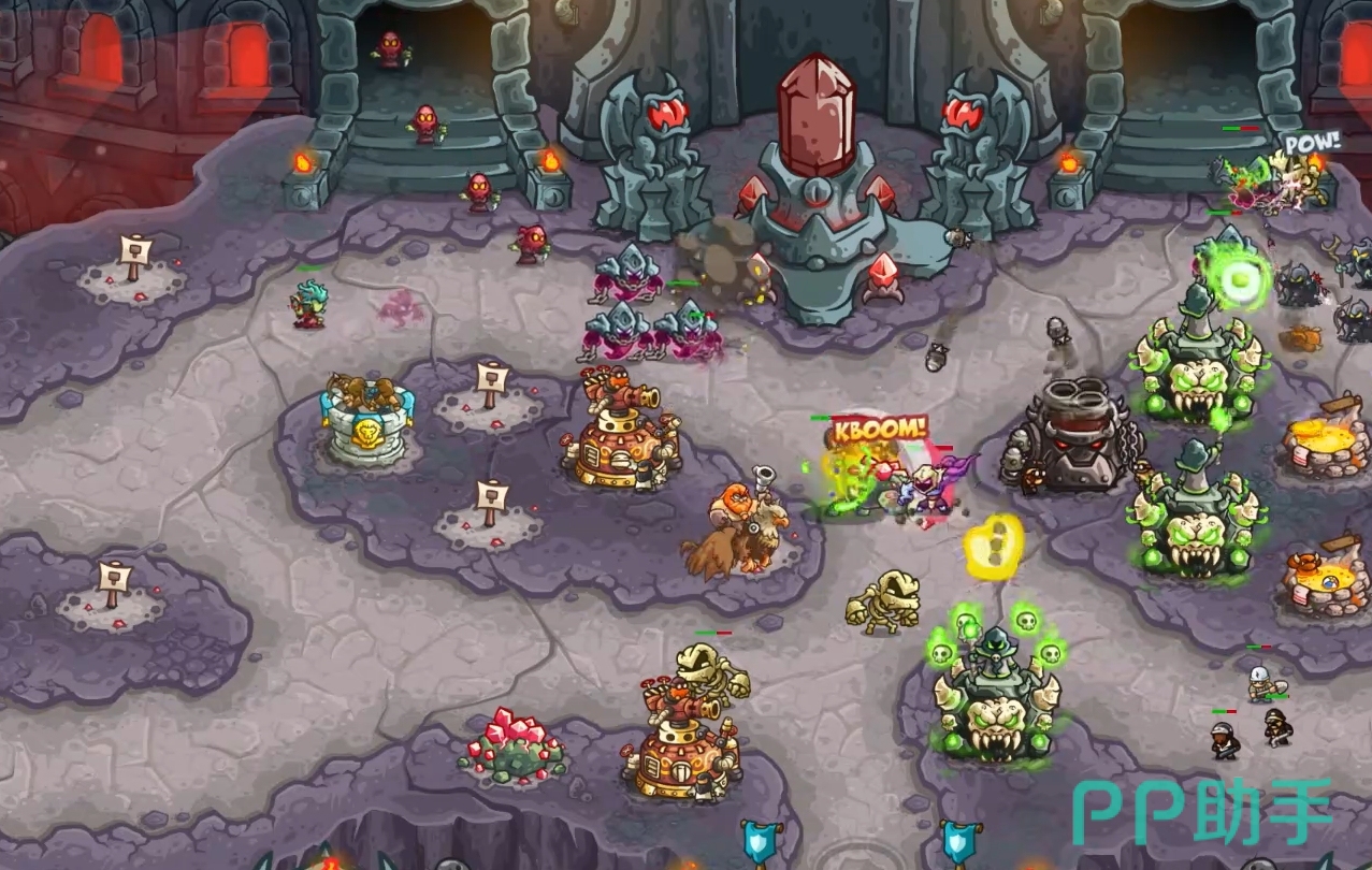 要注意,部分坑位上会存在水晶,敌人会时不时点亮地图中线上方的水晶,来唤醒水晶怪物参与战斗。这些水晶怪物在强度上等同于小精英怪,血量较厚但没有特殊的机制,所以只要用兵卡住就能轻松应对。水晶怪每次都只会唤醒一个,它们起身后原本的坑位会转化为可放置防御塔的状态,可在上边建黄金弓箭手来补输出。当场上所有的水晶怪物都召唤出来,后续便不会再出现。