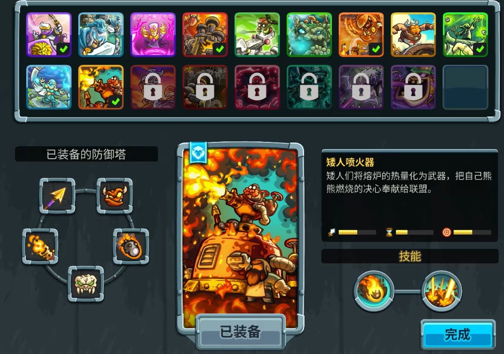 在防御塔的搭配和英雄的选择上,可用矮人喷火器、三管加农炮、死灵法师、恶魔熔坑、皇家弓箭手的防御塔组合,其中矮人喷火器和三管加农炮前期主力,死灵法师来弥补后期,恶魔熔坑和皇家弓箭手视情况来补防线和补伤害。英雄可用格里姆森和布卢登。初期敌人只会从左边两个口出兵,只要各位在左半边地图靠近中线的防御塔坑位上各造一个矮人喷火器,且把它们升级至满星,就能轻松应对。等上方两个出兵口出兵后,再在右半边地图靠近中线的坑位上建造死灵法师,共要造三个。这样一来,整个防线的雏形就基本上搭建完成了,后续只要根据需要来补足防线即可。