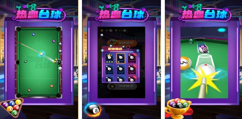 热血台球也是款以桌球为主题的休闲运动类游戏,本作完美还原了台球的规则和台球室内的环境,物理规则展现完善也让台球爱好者心驰神往,真实的台球竞技乐趣让台球迷耳目一新,新奇的挑战关卡加持会让玩家打台球的实力提升不少,屏幕前各位喜欢台球竞技类游戏的朋友赶紧试试热血台球吧。