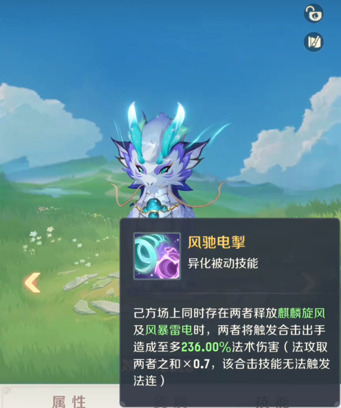 其次就是风麒麟的被动技能“残血反杀”,当风麒麟的生命值低于30%时就会触发被动技能,且触发之后可以提升15%法术攻击力和10%暴击率,同时还可以减少20%的伤害。该技能可以有效增加风麒麟的存活率,而且在残血状态下的实力增加还可以帮助风麒麟反杀敌人。羁绊技能“天雷共鸣”,当和特定的灵兽共同出战时,可以将麒麟的技能提高20%,且会额外增加3秒的感电效果,提升输出能力。