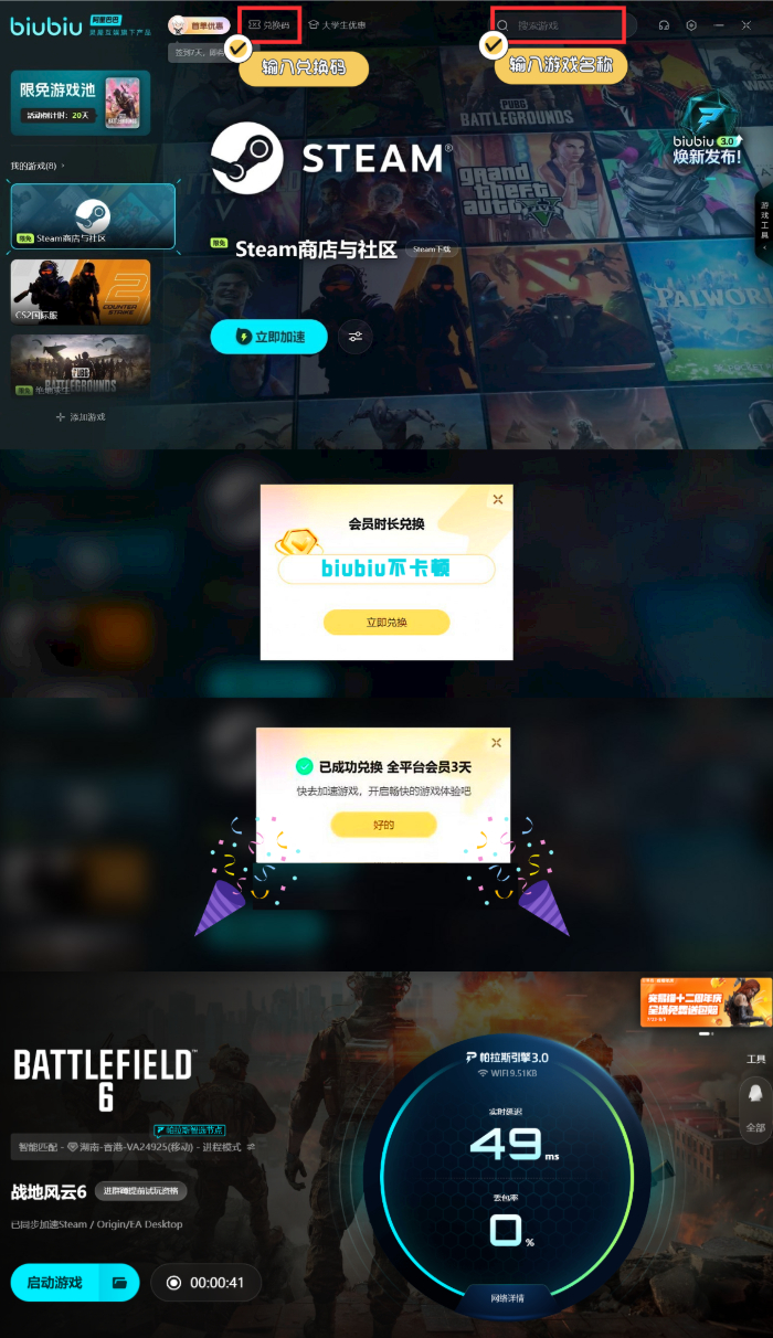 值得一提的是,biubiu加速器在用户使用流程方面也做到了极致简洁与智能化。用户只需下载安装并注册账号,即可获得24小时的免费加速体验。同时,在加速器中输入专属口令【biubiu不卡顿】,即可额外领取72小时免费加速,总计高达96小时的免费使用时长。这一福利不仅降低了用户的试用门槛,也帮助玩家更直观地感受到biubiu在提升战斗稳定性、减少断线重连等方面的强大优势。尤其对于刚刚入坑《战地6》的新玩家而言,这样的服务显得尤为贴心。