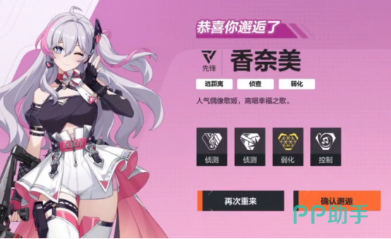 香奈美也是很多玩家喜欢的角色之一,第1道题选择可爱,第2套题直接选择c全知全能,第3道题选择a近距离作战狭路相逢勇者胜,第4道题继续选择a就能够获得香奈美这样的角色了作为人气偶像歌姬,具有相当出色的侦察功能,非常适合远距离作战,同时也有控制作用。