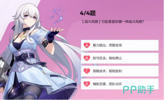 在心弦邂逅这个任务活动当中共拥有四道选择题,每道题目选择不同,最后所邂逅的角色也是有所差异的。游戏中的角色较为丰富,关于众多热门角色的相应选择攻略为大家介绍帮助你寻找到心仪的角色。伊薇特是很多人非常喜欢的角色,第1道题选择可爱,第2道题会询问玩家上手难易度对于游戏战场了解多少,可选择 a一无所知,第3道题问玩家喜欢哪一种战斗方式,选择a选项近距离作战狭路相逢勇者胜,最后一道选择题问玩家喜欢哪一种战斗风格,同样选择a暴力输出秀翻全场,当提问结束之后就能够获得此角色了。此角色对于新手比较适合,近战输出整体的爆发力极强,操作简单易上手。