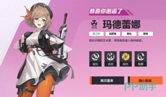 想要获得玛德蕾娜具体的题目选择为aacd,作为非常容易上手的特色角色,具有着极强的控场作用,也非常适合远距离作战,定位于阳光开朗的艺术家。各技能都有着极强的控制作用,在整个团队当中担任着非常重要的辅助作用,尤其是烟雾可以快速扰乱敌人的视线,为我方提供良好的射击机会。每次所获得的角色如果并不满意,那么可以直接选择再次重来,如果喜欢此角色可点击确认邂逅。