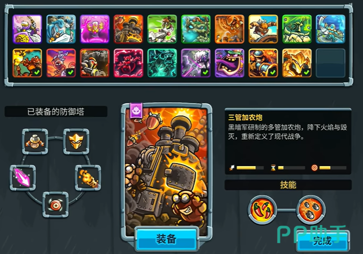 二是三管加农炮和奥术法师,三管加农炮在初始阶段以开荒为主要能力,因为他的伤害性是非常高的,在攻打敌人时能够降下火炮,对其造成毁灭性的伤害,在战争中是不可或缺的。奥术法师拥有秒杀敌人的能力,顷刻间就能够击杀大范围的敌人,并且不会给敌人任何还击的余地,应对拥有高血量的敌人时奥数法师这个防御塔再适合不过了。