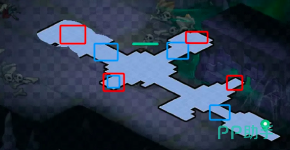在图片当中小编用红蓝两种方块进行了划分,蓝色标识的地方,一般都是无怪兽出没,可直接拿到的宝箱。而红色方块都是需要玩家与boss战斗的位点。整体来看地图模式较为简单,而且在宝箱分布上,也是较为均匀的,大体按照直线前行即可,在左右两侧的小耳室里,能够拿到不少的宝物,但要注意拾取左右两侧岔路尽头的宝箱,难度系数可能会偏高。