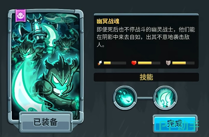 除了换位外,幽冥战魂还有两大技能,其一是永恒恐惧,当幽灵战士战败时会扑向敌人,造成真实伤害的同时降低敌人的速度,从侧面提升了幽灵战士的拦截效果,玩家若将换位能力利用得好,甚至能做到让幽灵战士一直拖住敌人。它的另一技能是灵魂虹吸,能让幽灵战士的伤害提升50%,但需要幽灵战士先战斗5秒才能触发,且非战斗情况下并不会计时,从战斗中退出后该效果也会随之消失,在关卡前期关卡血量低时用起来效果很好,关卡后期效果则没有那么出色。