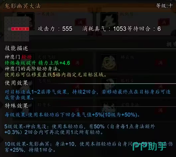 第4个推荐的是神鹰门的轻功——鬼影幽冥大法,在使用后,可向直线五格内无目标区域进行移动,而在下一回合当中与一伟渡江有着同样的集气值。且在范围内的敌人,可直接造成1~2层的置气效果,激活置气效果后集气速率可直接减少5%,并能够持续两个回合,叠加层数最高达9层。闪避能力可增加50%,被击伤害可增加25%,不过仅能持续一回合,是一款低配版的一苇渡江,可以给其他队友使用。