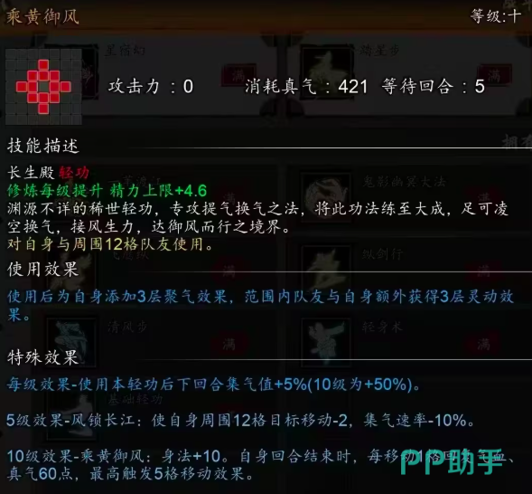 第四个是长生殿轻功——乘黄御风,集气值,同前几个轻功是一样的。但是在使用该武学后可以添加三层聚气,玩家的机器速度提升5%,且可持续两个回合,最高同样可叠加9层。并且通过该武学能够使自身,和周围两个以内的队友,获得三层的灵动。而他的被动技能风锁长江,不仅能够使敌人移动减二,而且还可以让他们的机器速率降低10%。