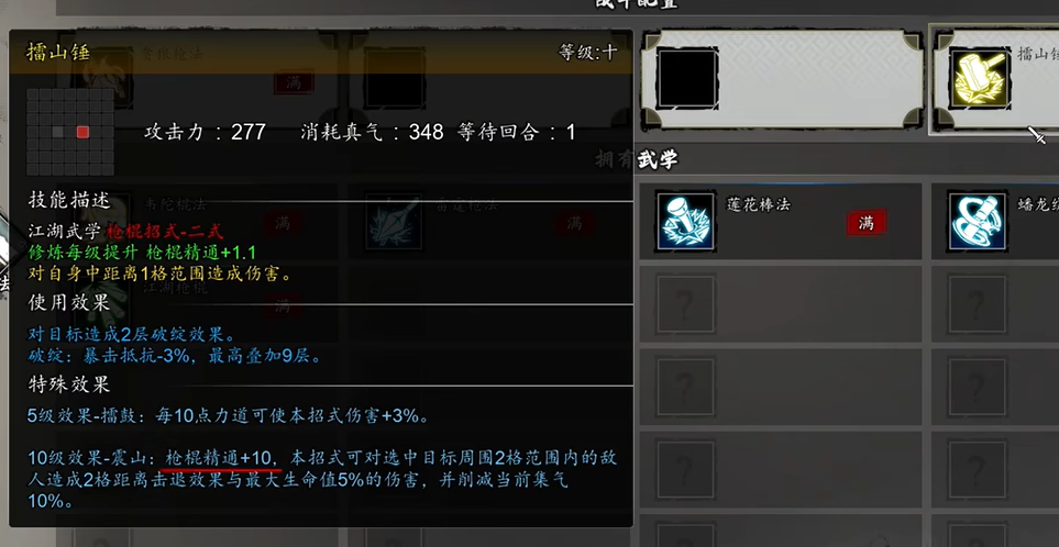 逸剑风云决这款游戏新增了很多的武学内容,其中就包括擂山锤、雷霆枪法、中平枪法、金刚锤、穿云一枪、叶家枪法等十分重要的武学。擂山锤的攻击力为277,在使用擂山锤这项武学时需要消耗348的真气。它属于普通的枪棍招式武学,与敌人作战时可以对近身1格范围内造成一定的伤害,每次命中一个目标敌人时,暴击敌人时可以降低对方的抵抗力到3%,同时可叠加9层伤害。这套武学对于自我保护以及进攻敌人来说,也达到了一个很好的效果,新手玩家也可以很快学会。