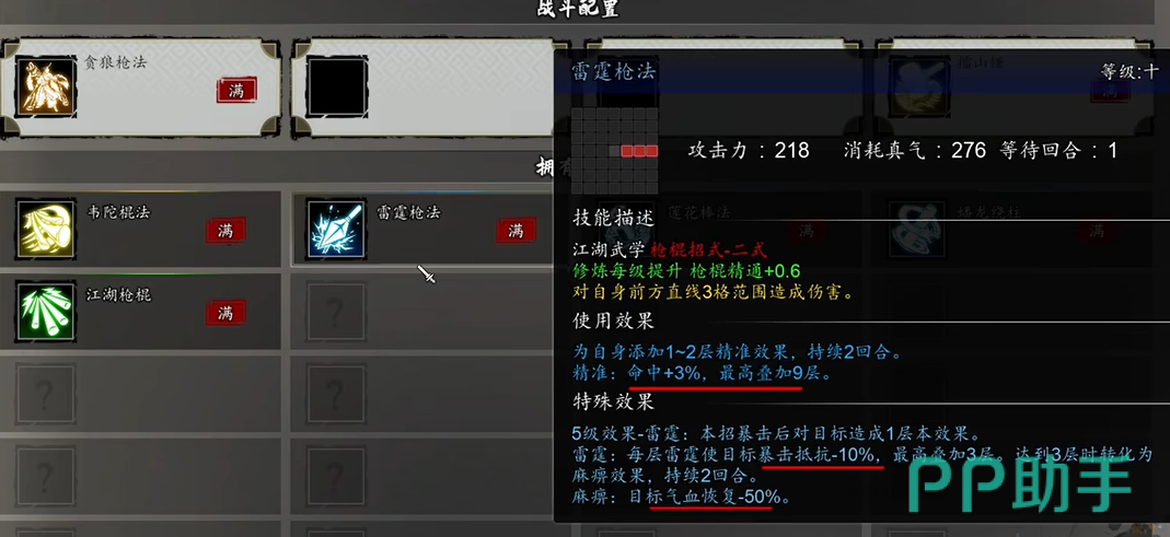 雷霆枪法攻击力为218,在使用时需要消耗真气276,在江湖武学中属于枪棍招式二式,在作战强度方面比撼地锤的实力要高一些,通过不断的修炼与等级提升,枪枪棍精通每次增加0.6。位于正前方的敌人可以造成直线三格范围的伤害,这就需要玩家找准攻击敌人的具体位置,攻击力能够达到更高的一个层次。这项武学技能在暴击敌人时可以让每一层敌人的抵抗力下降10%,最高叠加三层,达到三层时可以转化为麻痹效果,从而降低了暴击敌人的难度,受到麻痹之后的敌人血量将会降低至50%,杀伤力还是很强的。