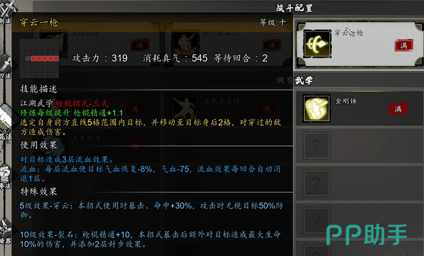 穿云一枪的攻击力为319,真气的消耗相对来说也比较高,可达到545。所以这项武学技能非常适合输出攻击。本招式在使用时可以选择正前方敌人进行5格范围,并瞬间移动至敌人身后2格的穿透性的伤害。